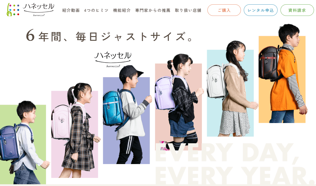 ハネッセルは、水野鞄店が取り扱うランドセルブランドです。「6年間、毎日ジャストサイズ」というコンセプトのもと、成長していくお子さんの体に合わせてランドセルがフィットするようになっています。